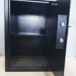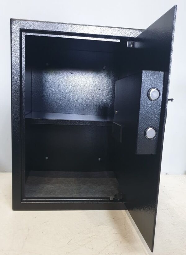 New Economical Safe Box! Nikawa Security Safe NEK500. Open & Close with 3-8 digit code. Override key for emergency use. 3 indicator lights( green, red and yellow), Indicate open, Low battery and warning. Use the knob to open and close with solenoid system. One way locking bolts. Change the code easily with the reset button. Interior protective floor carpet. 4 x 1.5 V, AA batteries. Pre-drilled holes at the bottom and back, fixings included. External size: (H)50 x (W)35 x (D)39cm