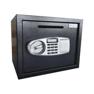 Premier Night Deposit Safe DP30LP (Front), it is our fastest selling night deposit safe due to its low price-point and the size. Password can be programmed to your favorite numbers (3-8 Digits), 2 set of passwords can be programmed. Comes with 2 emergency keys, emergency keys can be used to open the safe if the electronics are faulty or if battery is weak. Exterior (H x W x D) :300 x 380 x 310 mm. Weight: 15kg. Capacity:29L. Free Delivery to ground/lift accessible level. 1 year product warranty.