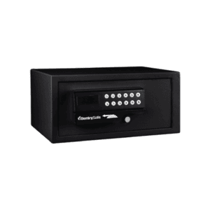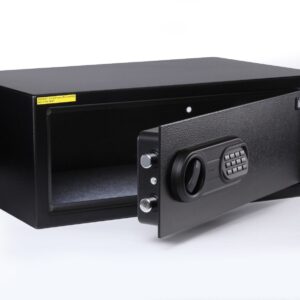 SentrySafe Hotel Safe HL100ES. Electronic lock, pin or card swipe to open. Override key function. Auxiliary Battery Pack for backup access. Solid Steel pry-resistant door & body 2 live locking bolts. Interior LED Light. Carpeted Floor. Fit up 17″ laptop computer. Exterior(H x W x D): 22.9 x 45.7 x 40.6(cm). Interior(H x W x D): 21.7 x 45.2 x 31.5(cm). Weight: 13.9 KG. Free Delivery. 1 Year Product warranty.