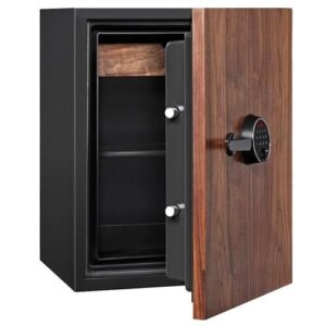 Diplomat Next Premium Safe DPS6500. 1 Hour Fire Resistance at 1010°C. Operation: Fingerprint + Touch Screen. Exterior: H700 X W500 X D541 (mm). Interior: H530 x W380 x D320 (mm). Weight: 130 kg. Capacity: 64 Litres. Tray: 1. Shelf: 1. Color: Wood. Access Code: 4 to 16 digits. 4 way Locking; 8 solid locking Bolts. Free Delivery To Lift/Ground Level. Warranty: 1 Years.