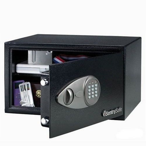 The SentrySafe Security Safe X105 has an electronic lock with override key, 2 live locking bolts, security cable feature, bolt-down kit (hardware included), carpeted floor and a removable shelf. It is large enough to accommodate most laptops.