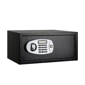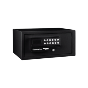 SentrySafe Hotel Safe H060ES. Electronic lock, pin or card swipe to open. Override key function. Auxiliary Battery Pack for backup access. Solid Steel pry-resistant door & body. 2 live locking bolts. Interior LED Light. Carpeted Floor. Exterior(H x W x D): 17.8 x 38.1 x 27.9(cm). Interior(H x W x D): 16.5 x 37.6 x 18.5(cm). Weight: 9.1 KG. 1 Year Product warranty.