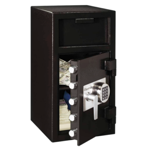 SentrySafe Deposit Safe DH-134E. Easy-to-pull top portion to deposit valuables. Programmable electronic lock with time delay. Relocking device. Solid steel construction – 12mm door, 3mm body. 3 live-locking bolts – 24mm. Anti-pry door. Anti-fish hopper. Heavy duty vault ball bearing hinge. Hardened steel anti-drill lock plate. Bolt-down kit included. Exterior(H x W x D): 68.6 x 35.5 x 39.6(cm). Interior(H x W x D): 44.5 x 34.8 x 28.7(cm). Weight: 55 KG. Free Delivery. 1 year product warranty.