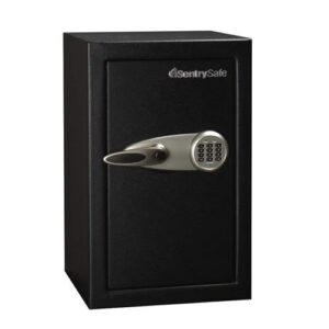 SentrySafe Security Safe T0-331. Electronic lock with override key lock. Solid steel construction. Door plate thickness 6mm. Wall thickness 3mm. Concealed hinges. 3 live-locking bolts. 3 adjustable carpeted shelves. Door back hooks. Bungee organisational system. Carpeted interior. Flush floor for easy access. Bolt-down hardware included. Exterior(H x W x D): 95.8 x 55.1 x 50.2(cm). Interior(H x W x D): 92.8 x 52.0 x 35.9(cm). Weight: 99.8 KG. Volume: 169.75 litres. Free Delivery. 1 year product warranty.