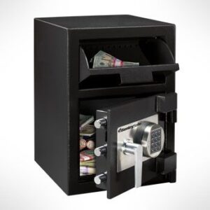 SentrySafe Deposit Safe DH-074E. Easy-to-pull top portion to deposit valuables. Programmable electronic lock with time delay. Relocking device. Solid steel construction – 12mm door, 3mm body. 3 live-locking bolts – 24mm. Anti-pry door. Anti-fish hopper. Heavy duty vault ball bearing hinge. Hardened steel anti-drill lock plate. Bolt-down kit included. Exterior: 50.8 x 35.5 x 39.6(cm). Interior: 26.7 x 34.8 x 28.7(cm). Weight: 43 KG. Free Delivery. 1 year product warranty.